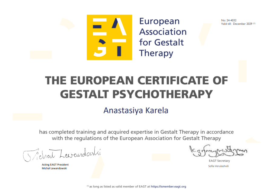 Меня зовут Анастасия, я — семейный психолог, магистр психологических наук, аккредитованный гештальт-терапевт (МГИ), член Европейской Ассоциации Гештальт-терапевтов (EAGT), тренер Батумского Института психотерапии (BIP).