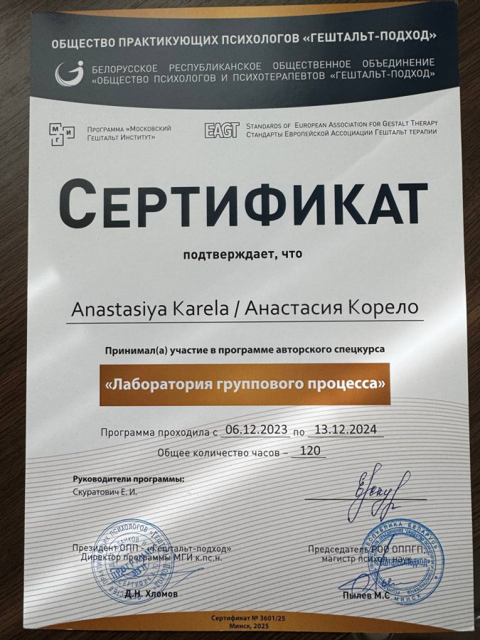 На данный момент сама обучаюсь на супервизора (3 ступень МГИ) и прохожу специализацию по работе с кризисами и травмами. У меня также есть уже завершенная специализация по работе с детьми, подростками и семьей, а также спецкурс по работе с группой.