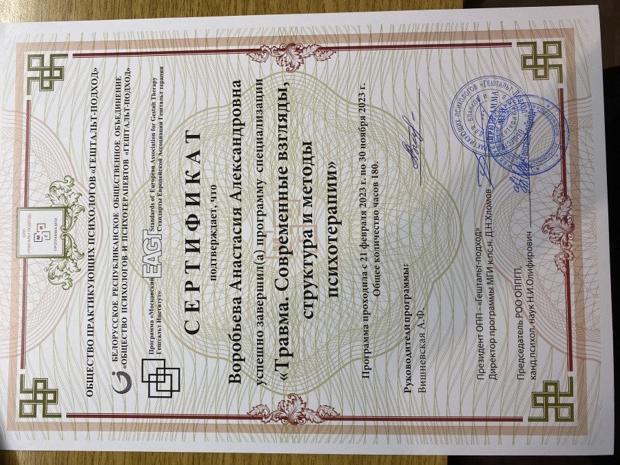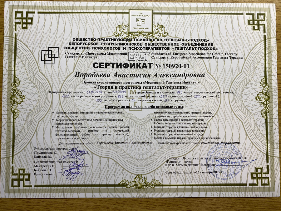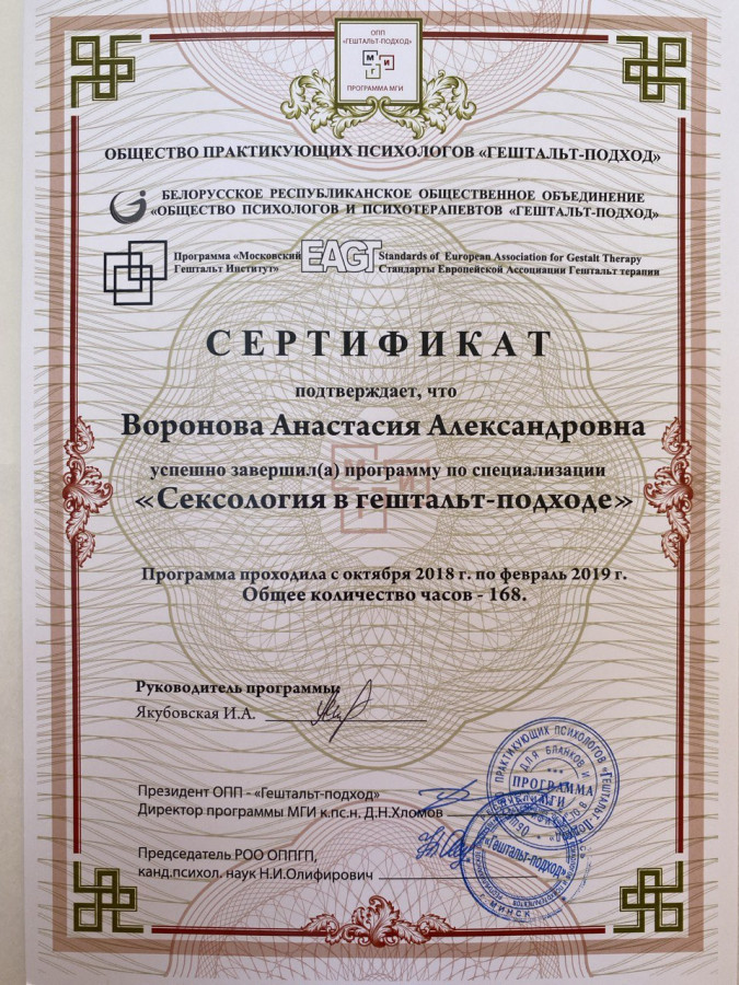 Мои основные принципы: профессионализм, а это значит постоянное саморазвитие и обучение; уважение и твердое соблюдение этических норм; чуткость, открытость и честность в отношениях со своими клиентами.