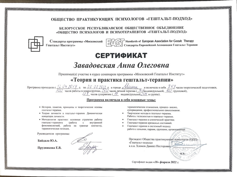 Мои основные специализации, завершенные на сегодняшний день: «Работа с нарушениями пищевого поведения и телесной осознанностью»