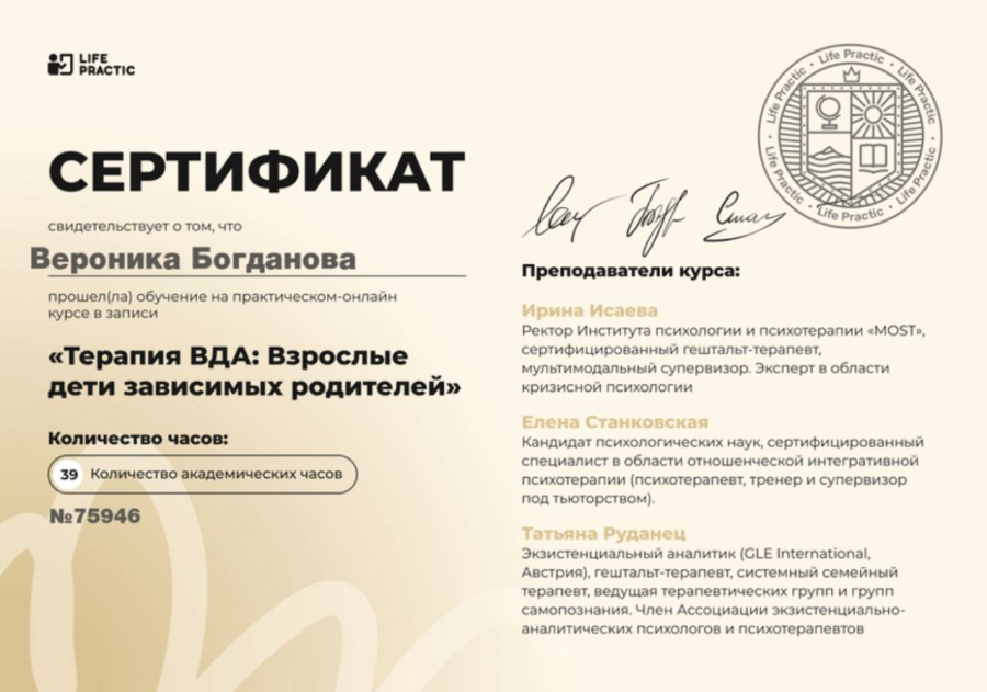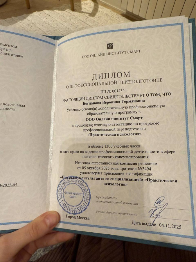 Имею две переподготовки на базе высшего образования: практический психолог (1300 часов), когнитивно-поведенческий терапевт (750 часов)