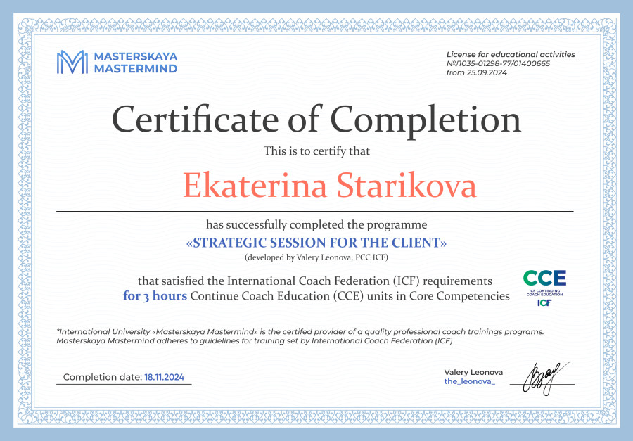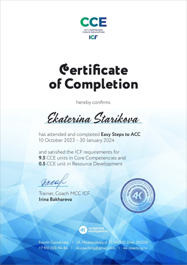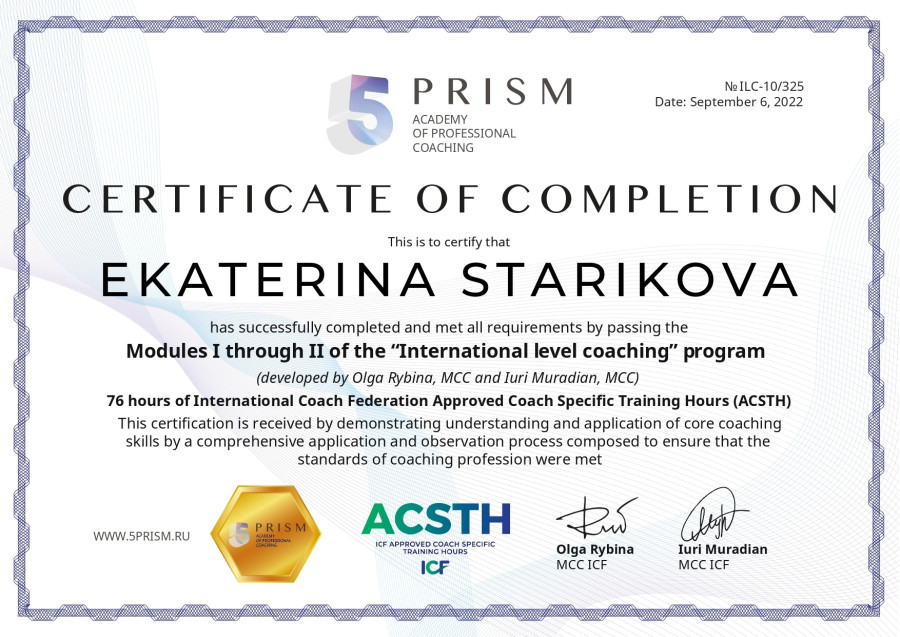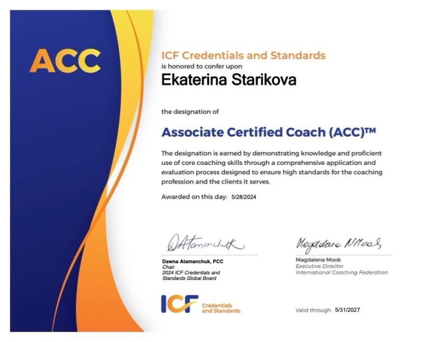 Так в моей практике появился коучинг. Я прошла обучение, сдала экзамен и получила сертификат международной ассоциации коучинга ACC ICF. С тех пор продолжаю учиться, например, не так давно получила диплом КПТ терапевта, и практиковать.