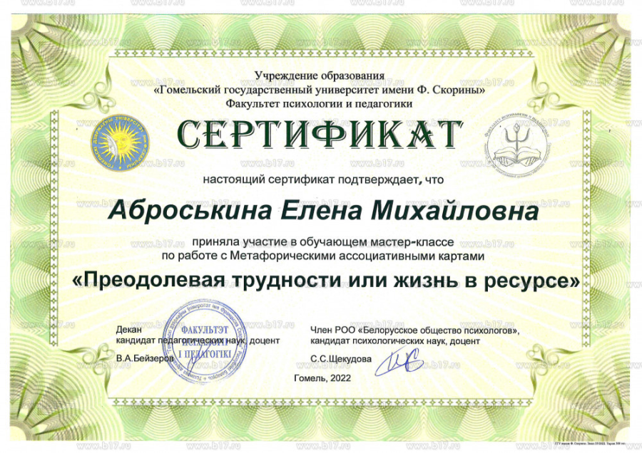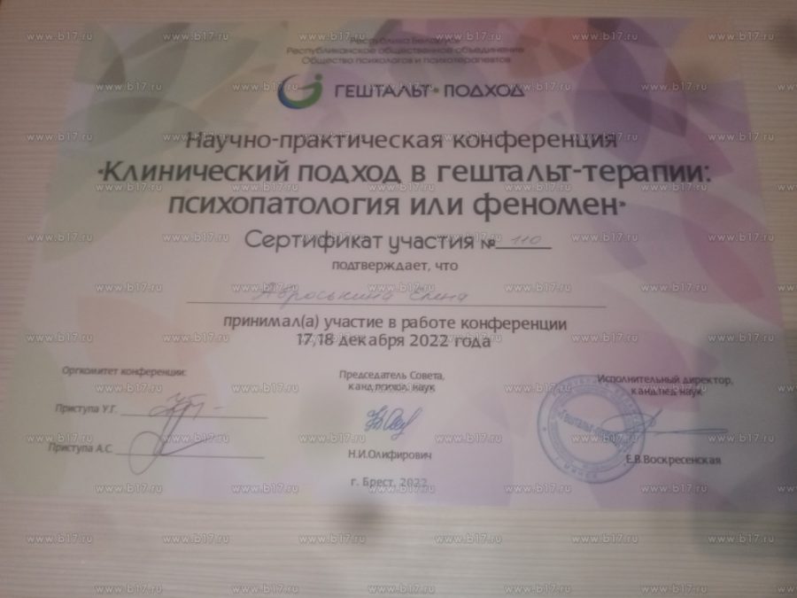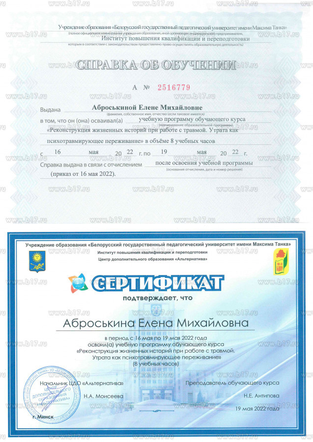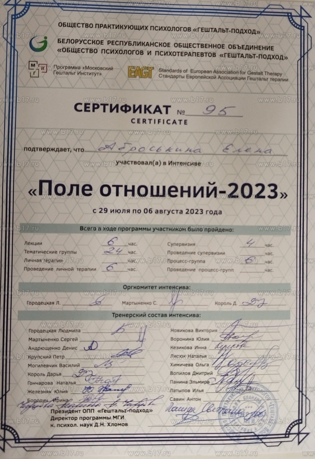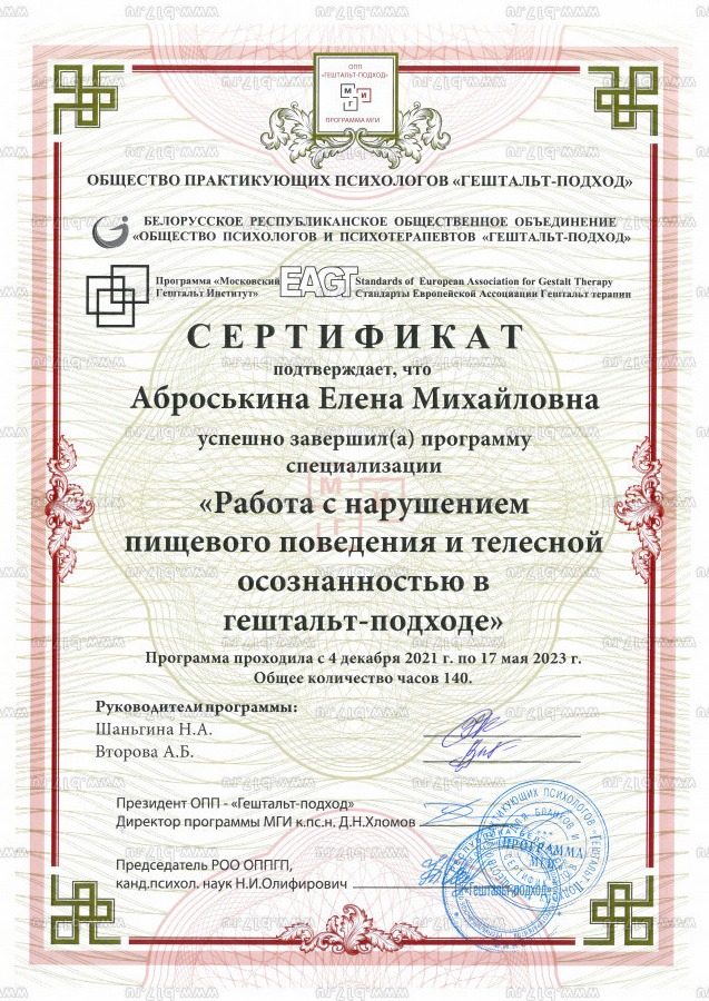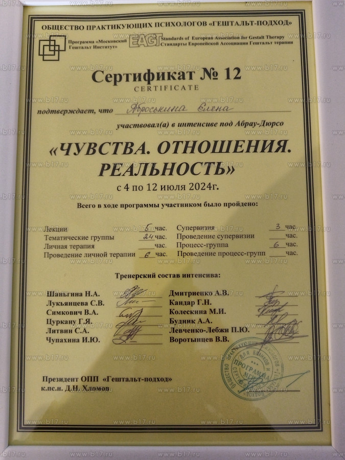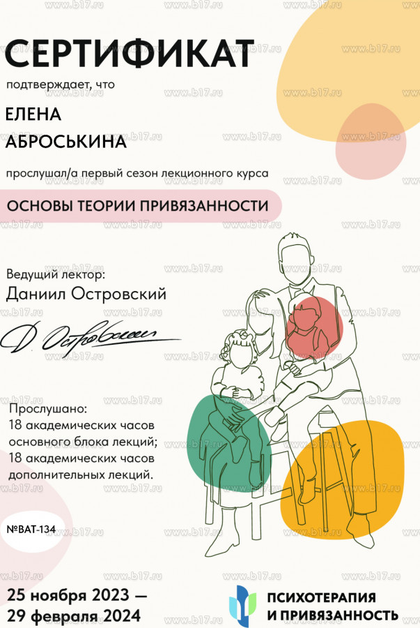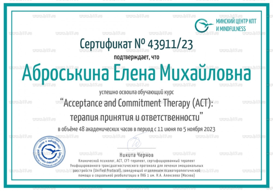 — Сертификат по **АСТ** — терапии для работы с тревогой, депрессией и РПП.