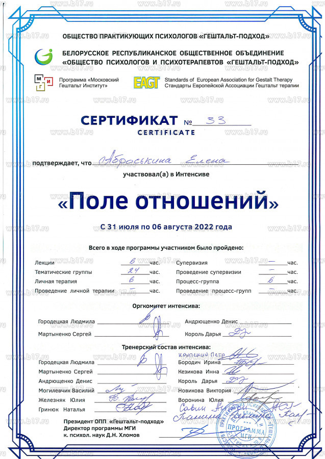 — Обучение в **Московском Гештальт Институте** (1-я и 2-я ступени).