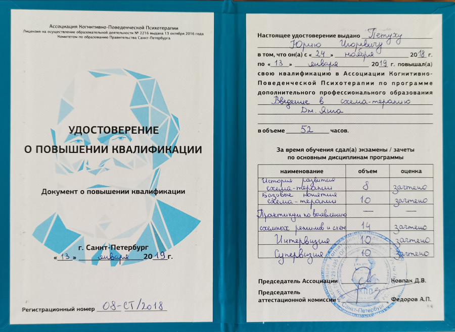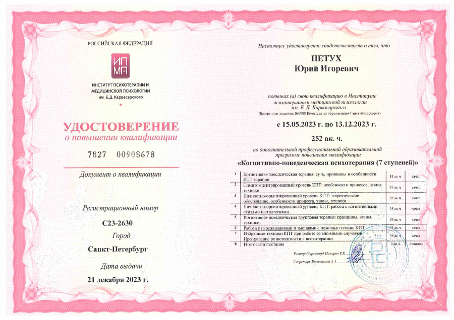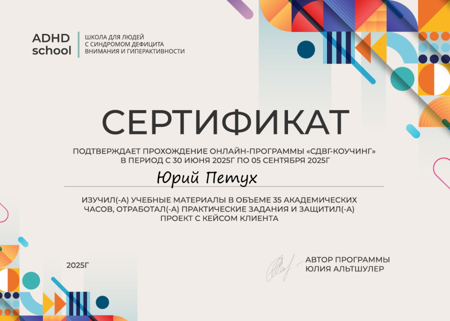 Я дипломированный врач-психиатр, когнитивно-поведенческий терапевт, схема-терапевт, СДВГ-коуч. Практикую более 5 лет, помог более чем 40 клиентам. Работаю в методах, имеющих доказанную эффективность. Регулярно прохожу супервизии (менторства опытных коллег). Для меня важен бережный и деликатный подход к клиентам, конфиденциальность и результативность терапии.