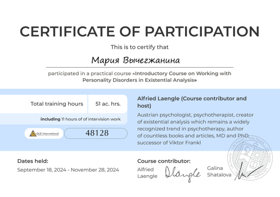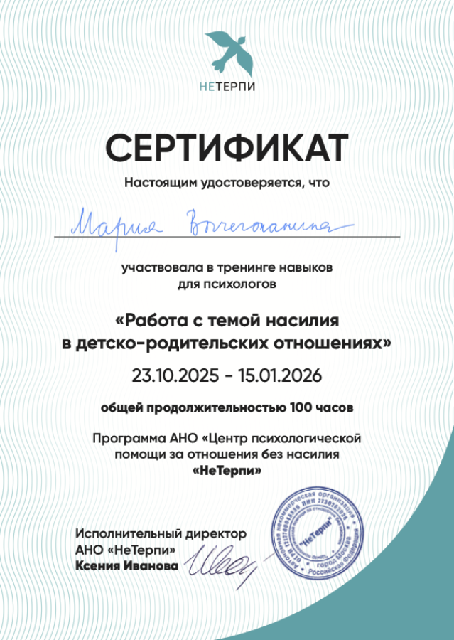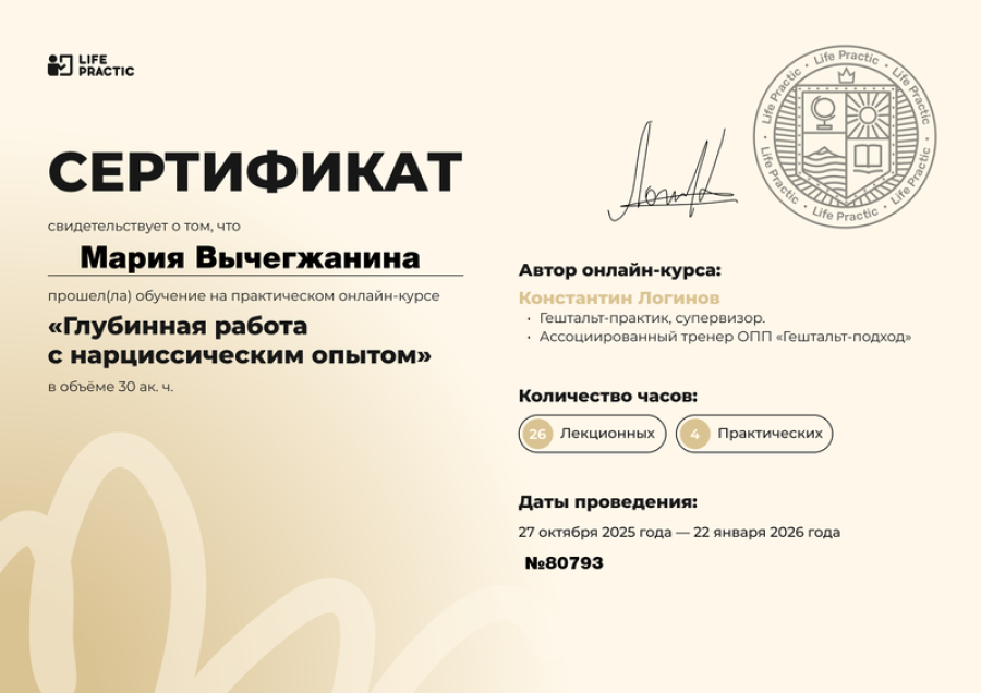 - Ежегодно повышаю квалификацию, сейчас учусь на специализации по ведению групп, работе с людьми с нарциссической адаптацией и также по изменению поведения в гешиальт-подходе.
