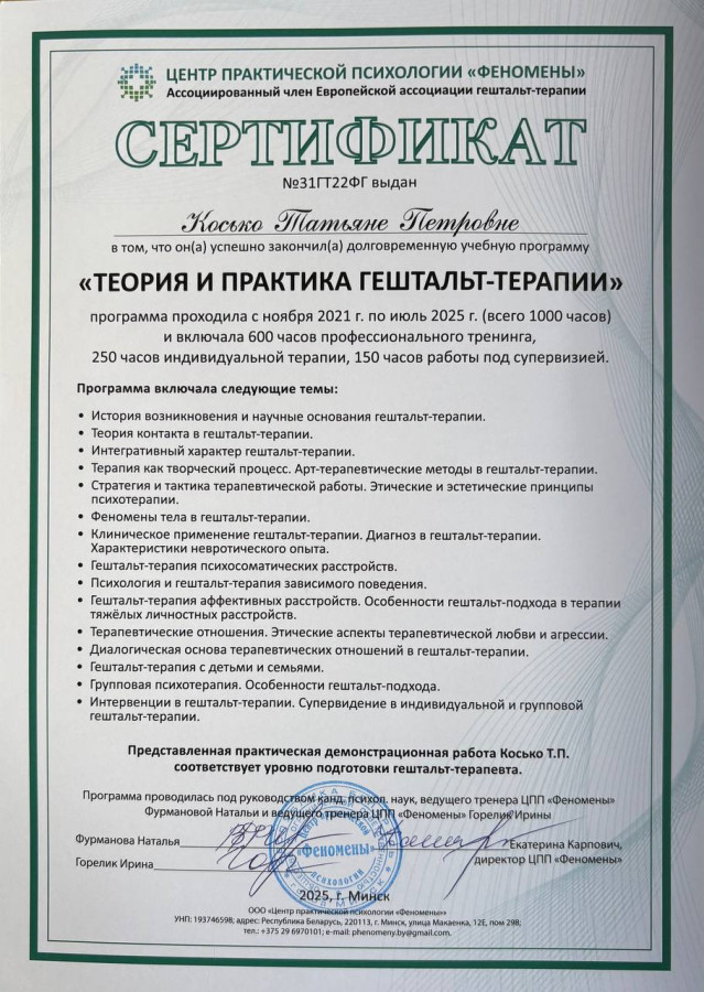 Меня зовут Татьяна, и я сертифицированный гештальт-терапевт.