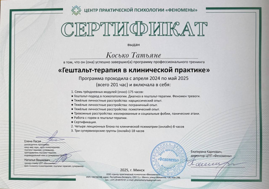 Моё профессиональное развитие — это непрерывный путь. Базовую 4-летнюю программу обучения методу гештальт-терапии я дополнила специализацией «Гештальт-терапия в клинической практике», а также сейчас прохожу специализацию «Семейная гештальт-терапия».