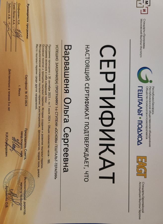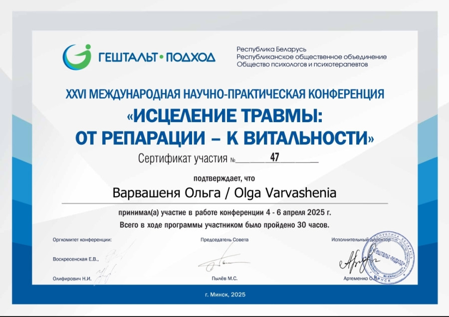 Меня зовут Ольга Варвашеня. Я дипломированный психолог, практикующий гештальт-терапевт.